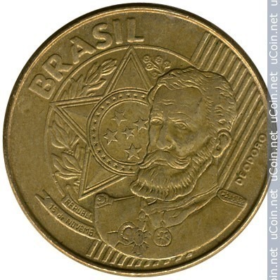 Moedas Segunda Familia do Real MOEDA DE CIRCULAÇÃO COMUM  DESCRIÇÃO ANVERSO: Apresenta a efígie de Manuel Deodoro da Fonseca, proclamador da república e primeiro presidente constitucional do Brasil republicano. Sua imagem está ladeada pelas Armas Nacionais e pelo dístico Brasil. REVERSO: Apresenta à esquerda, linhas diagonais de fundo que dão destaque ao dístico correspondente ao valor facial, seguido dos dísticos centavos e o correspondente ao ano de cunhagem.